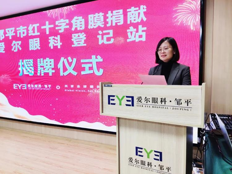 鄒平市紅十字黨組書記、常務(wù)副會(huì)長(zhǎng)黃蕊致辭。此次揭牌標(biāo)志著“鄒平市紅十字角膜捐獻(xiàn)愛(ài)爾眼科登記站”正式成立,將為因角膜病致盲的病人帶來(lái)復(fù)明的希望。鄒平愛(ài)爾眼科醫(yī)院將大力弘揚(yáng)“人道、博愛(ài)、奉獻(xiàn)”的紅十字會(huì)精神,進(jìn)一步推動(dòng)鄒平市眼角膜捐獻(xiàn)事業(yè)的發(fā)展,傳遞光明。